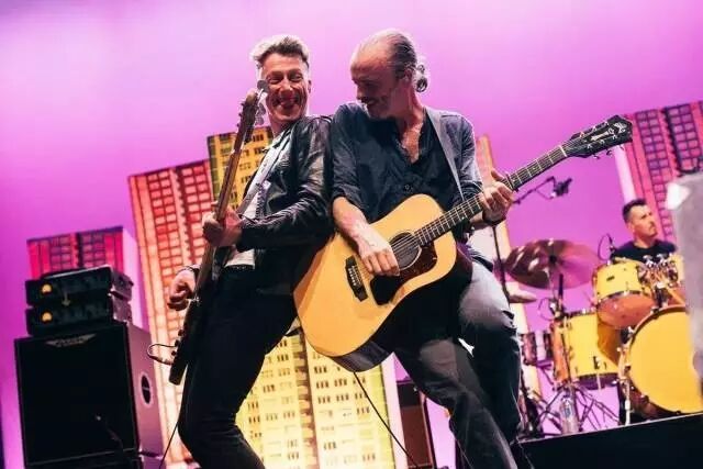 除了音乐的温暖有爱,Travis的几个成员之间也是温(基)情满满。Fran和Dougie从小就是好朋友,两人在台上是这样的: