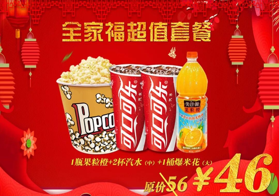 1瓶果粒橙(450ml)+2杯汽水(中)+1桶爆米花(大)