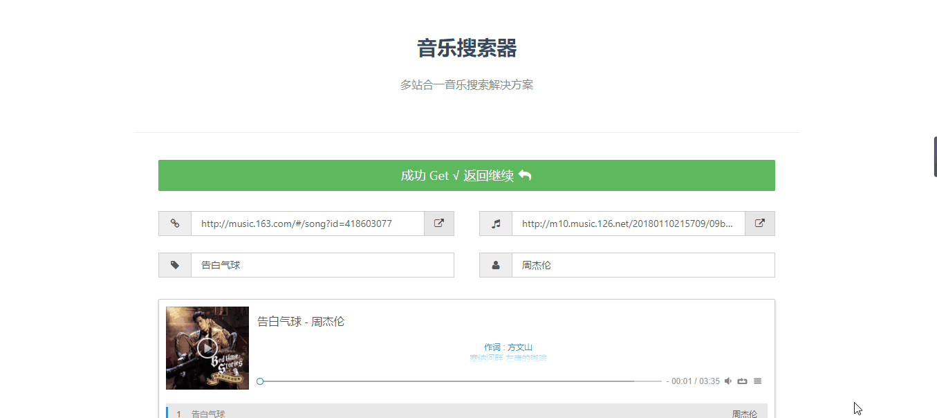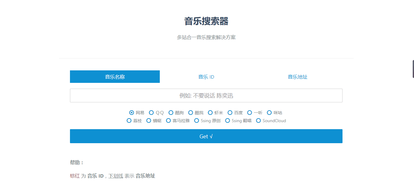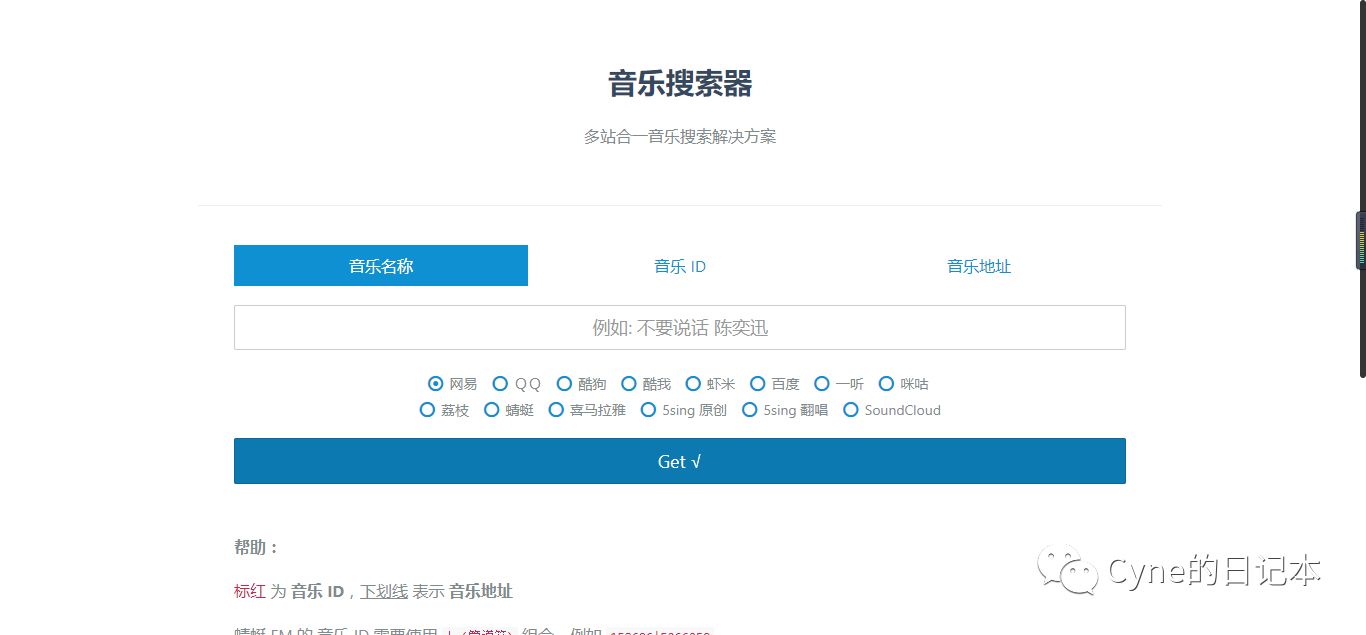 在搜索栏的下面可以更改源(比如有些歌曲网易没有,就可以用酷狗或者其它源进行搜索),然后点击“Get”就可以获取到歌曲的链接了。