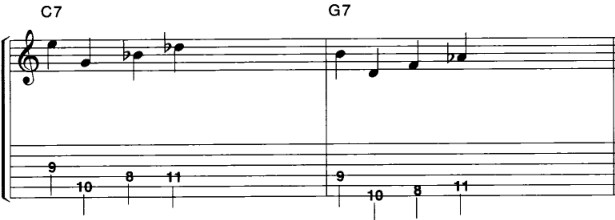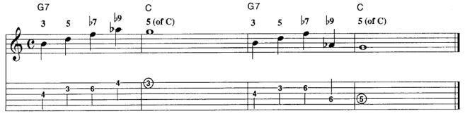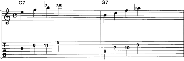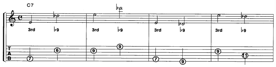 “3 to ♭9”经常会从一个属七和弦开始,比如我们弹奏一个C7,那么它的3音就是E,♭9音就是♭D,我们有很多从3进行到♭9的方法。最简单的方法就是直接跳跃,可以从3上升到♭9,也可以从3下降到♭9。