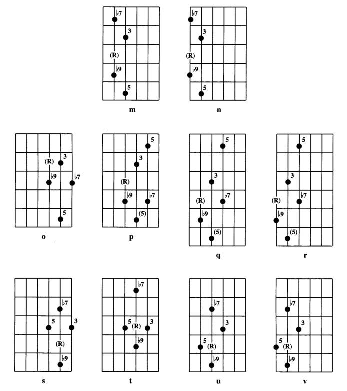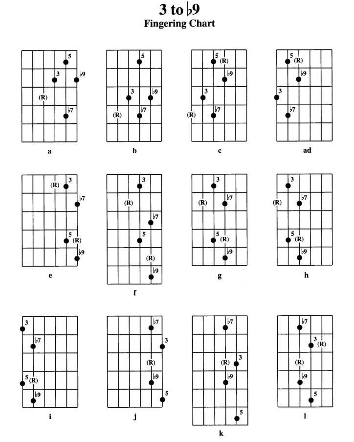 下面的和弦图和指法图,是指板上“3 to ♭9”的图例,(R)代表根音位置。