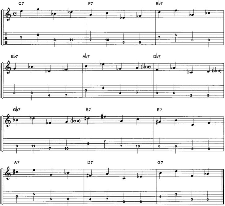 我们最好在所有12个音上都练习这个技巧,下面的练习是按照五度圈的排列进行的。