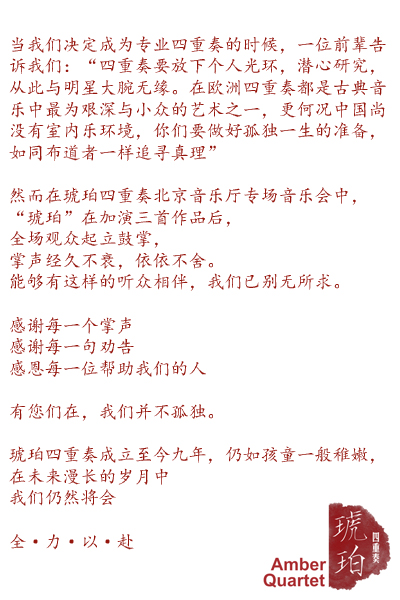 琥珀四重奏公众平台即将加入读者互动板块,如果您想表达观点,敬请留言,虽然您将会收到一条冷冰冰的系统回复,但是我们可是会认真的阅读哦,也许下一次您的观点就会出现在平台中,期待大家与我们互动!