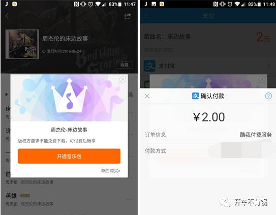 ☞ 应用简介 使用方法:选择付费歌曲,点击下载后选择单曲购买,弹出支付宝或微信购买页面后返回,提示购买成功。☞ 应用截图