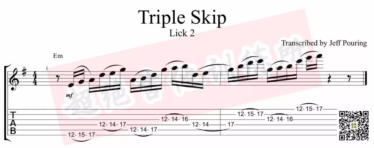 2.本练习是一个跨弦和击弦相结合的练习,在示范视频里,作者使用了“拨片和中指”结合的混拨奏法,详细请观看下面的示范视频;另一方面,如果某些朋友不习惯混拨奏法的话,只使用拨片去练习这个LICK也是可以的;