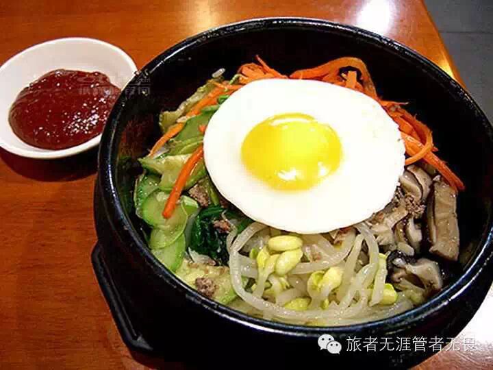 “石锅拌饭”又称“韩国拌饭”、“石碗拌饭”,是韩国以及中国东北地区黑龙江、吉林、辽宁特有的米饭料理。它的发源地为韩国全州,后来演变为韩国的代表性食物。韩国全州的石锅拌饭名闻遐迩,拌饭里蕴涵着“五行五脏五色”的原理。在石锅锅内放入米饭及菜肴,再烤到锅底有一层锅巴,喷香诱人,石锅是陶做成的,厚重的黑色陶锅可直接拿到炉具烹煮,而且保温效果好。细嚼慢咽的人可安心享用,不用怕饭菜冷掉。石锅拌饭材料并不新奇特别,主要为米饭、肉类、鸡蛋,以及黄豆芽、菌菇类和各式野菜,菜的种类并无一定,采用当季最对味的季节时令蔬菜去调配即可。