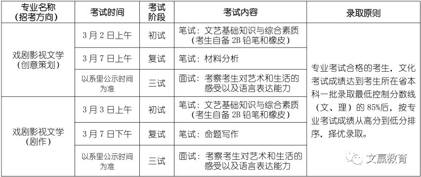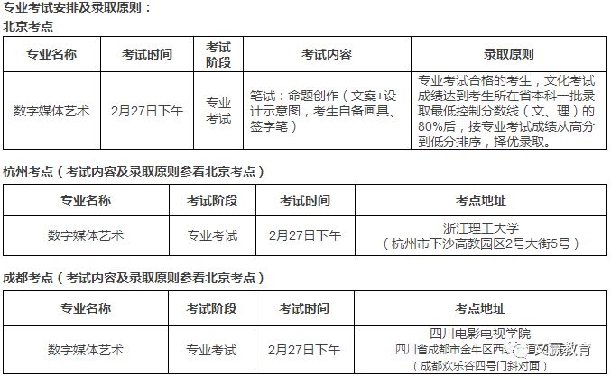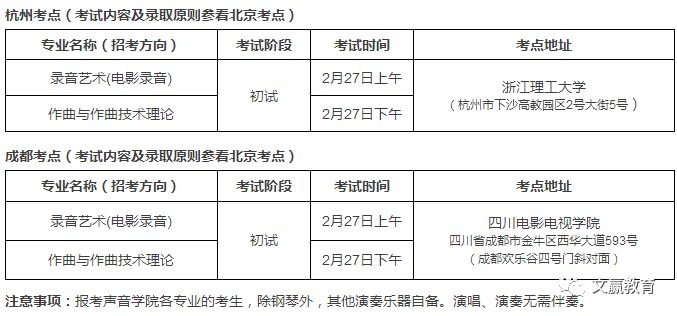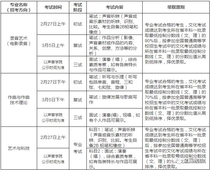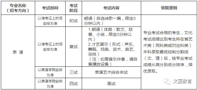 注意事项:报考表演专业的考生,参加专业考试时:一律不许化妆,严禁穿着增高鞋,使用增高垫;进入三试参加专业考试时请自备形体练功服、平跟软底鞋。戏剧影视表演专业,初试进入复试合格线依据表演学院划定的合格线为准;复试进入三试的合格线依据高等职业教育学院划定的合格线为准。进入高等职业教育学院三试的考生,需要参加高等职业教育学院组织的三试考试。