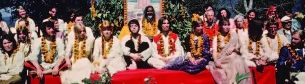 ▲1968年在瑞诗凯诗,The Beatles和他们的合作伙伴,从Starr(前排左二)开始从左至右依次是:Maureen Starkey、Jane Asher、McCartney、Maharishi Mahesh Yogi、Harrison、Pattie Boyd、Cynthia Lennon和Lennon(他正跟The Beach Boys 乐队的Mike Love聊天)