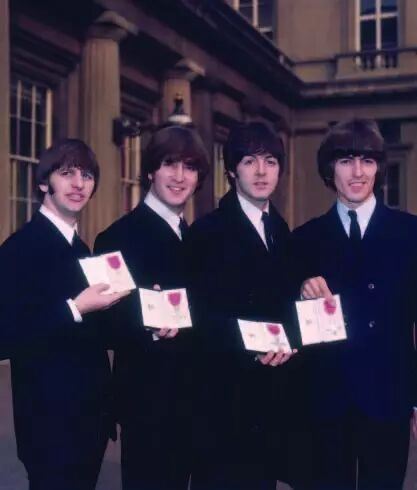 ▲The Beatles乐队在白金汉宫门前合影,手上拿着英国女王刚颁发的MBE(英帝国勋章)