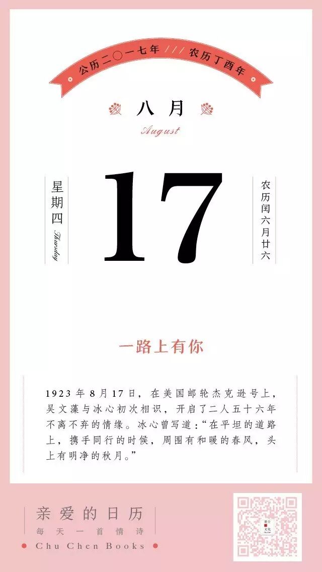1 9 2 3 年 8 月 1 7 日, 在美国邮轮杰克逊号上, 吴文藻与冰心初次相识, 开启了二人五十六年不离不弃的情缘。冰心曾写道:“ 在平坦的道路上, 携手同行的时候, 周围有和暖的春风, 头上有明净的秋月。”