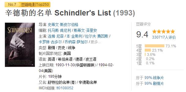 《辛德勒的名单》,只要看过这部电影,没有人不会说它是经典的,甚至是伟大的。在豆瓣上的评分高达9.4,光评论就有5万多条。