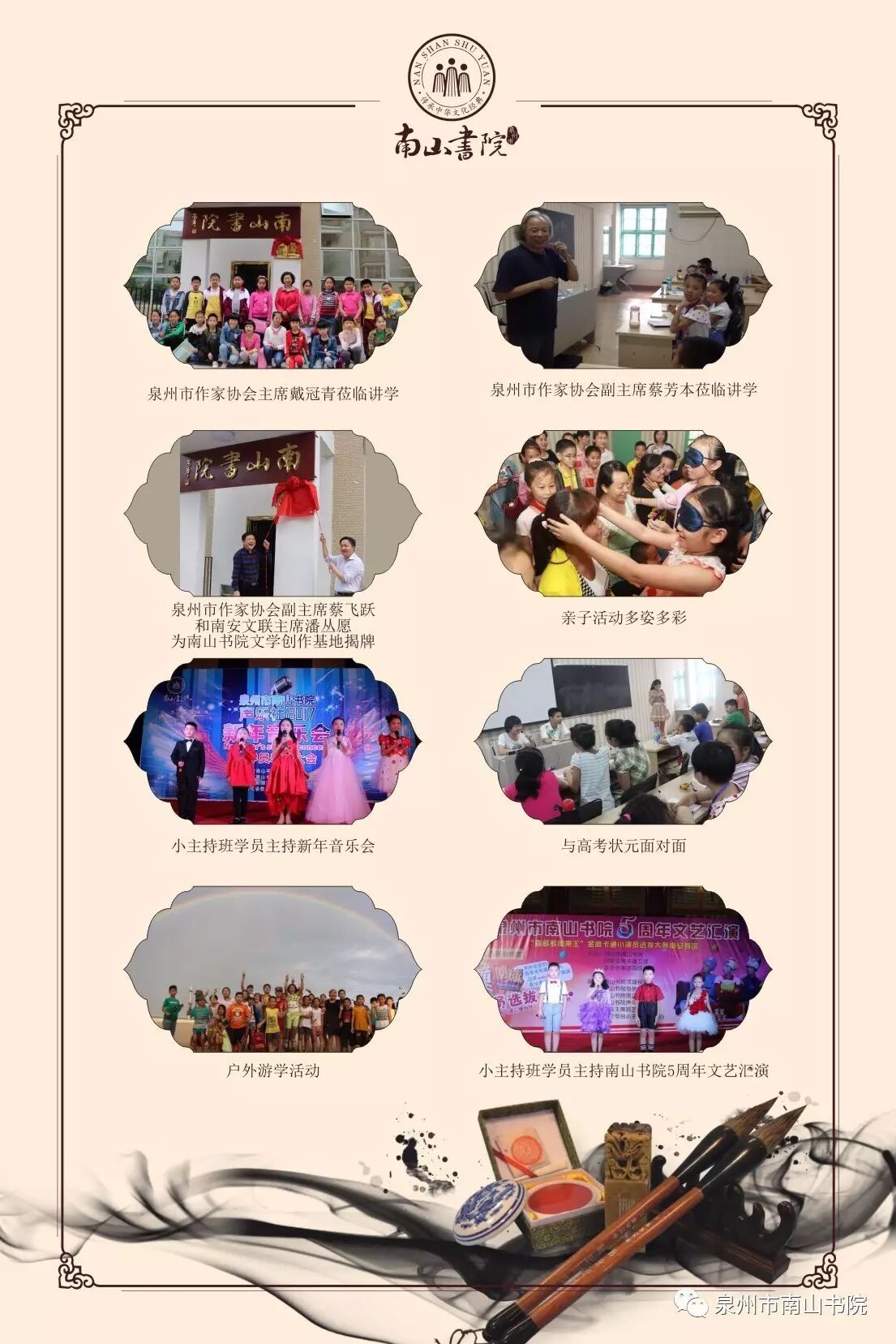 自开办以来,南山书院以新颖的教学方式、强大的师资团队和高品质的教学水平,深受广大家长和社会各界的好评。二0一四年九月至二0一六年三月,南山书院与《南安商报》强强联合,成为福建日报集团-南安商报教育培训中心·南山书院教学点,朝着品牌化、规模化、精细化方面发展,跻身为泉州地区教育培训领军品牌。二0一七年六月,南山书院小主持班与泉州音乐之声FM881开启合作办学之路,并成为国家级的青少儿艺术类考级项目——全国青少儿播音主持等级认证指定考级点;二0一七年七月,与洛江区作家协会联合推出“洛江区首届校园公益小作家班”。