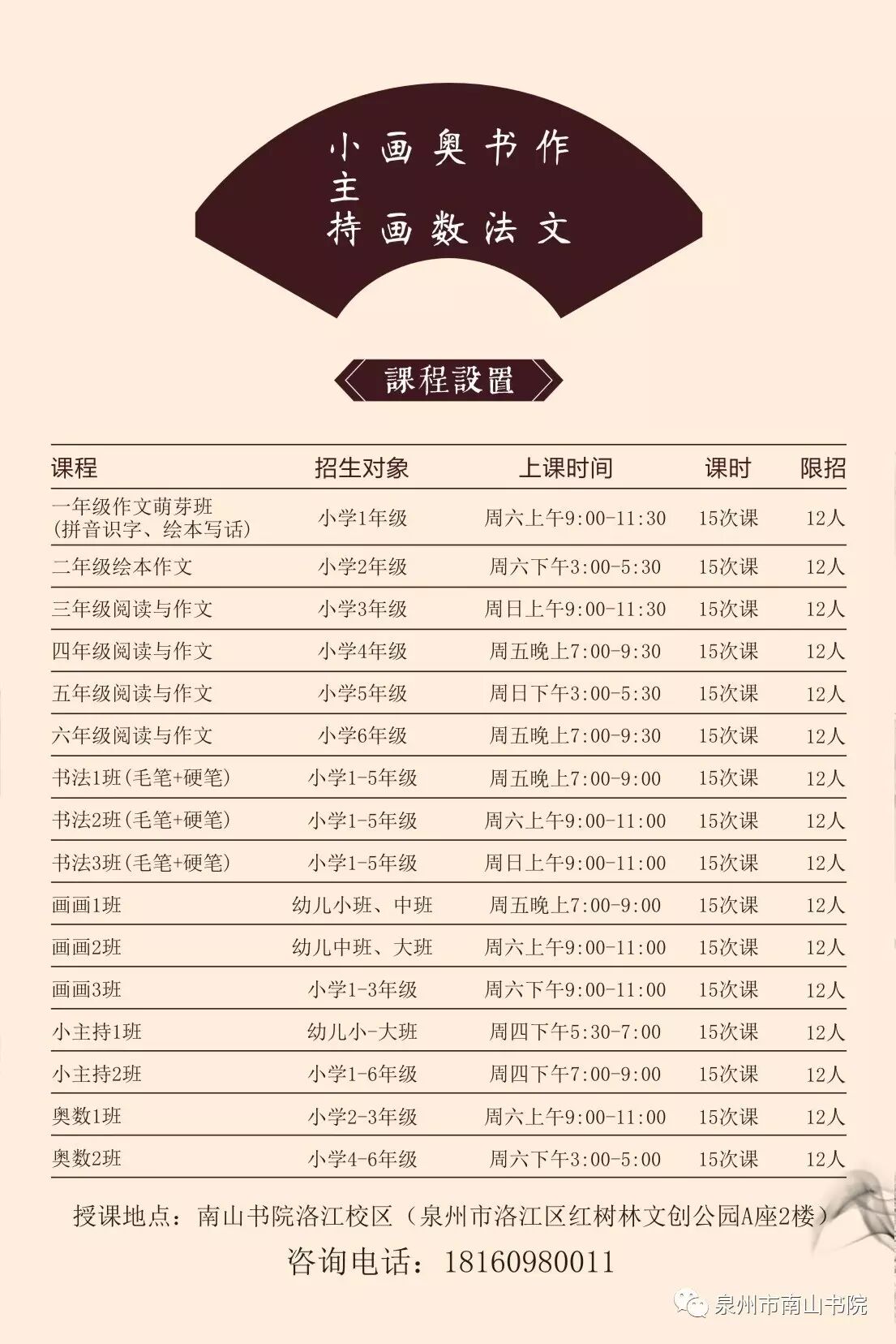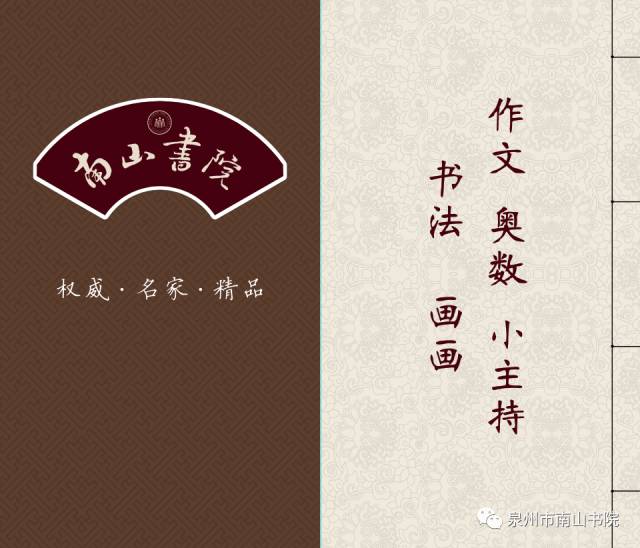 泉州市南山书院是一家专注于传统文化传播、青少年儿童课外培训和高端文化艺术交流的文化教育服务机构。目前开设作文、书法、奥数、画画、小主持等精品课程,设有泉州市洛江校区、南安双塘校区和南安电信大厦校区。