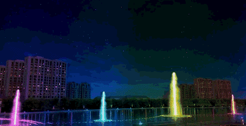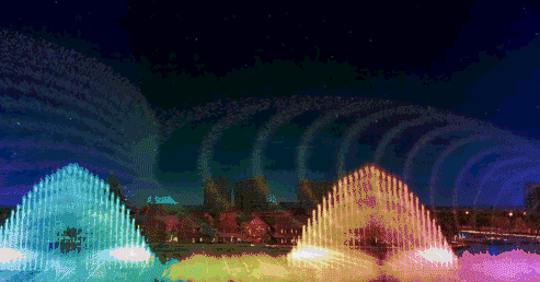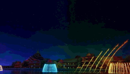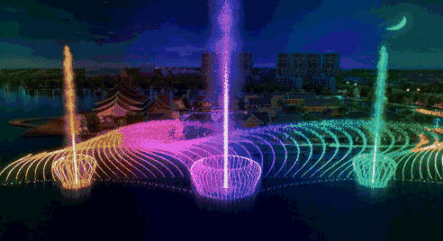 伴随着灯光,各种水形此起彼伏,错落有序。融入铿锵有力的音乐,风姿独特,吸引力极强。