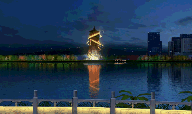 以3D投影的方式,展现华阳塔夜晚别具特色的风情。画面采撷龙舟、粤曲等本地文化元素,融入传统的中国龙翻腾,舞动的形象,结合建筑结构的构成演绎,以绚丽多彩的色彩与光影,将夜色下的华阳塔渲染得如诗如梦,亦真亦幻。