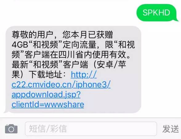 发送短信SPKHD至10086