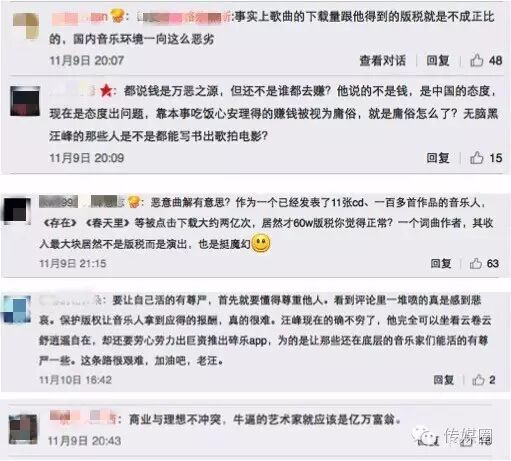 有网友表示:“他不是在为自己说话,而是为千千万万默默无闻地坚持音乐,却活在最底层的音乐人说话,并且实实在在地为他们做事”。另有网友更坚定地提出:“商业与理想不冲突,牛逼的艺术家就应该是亿万富翁。”