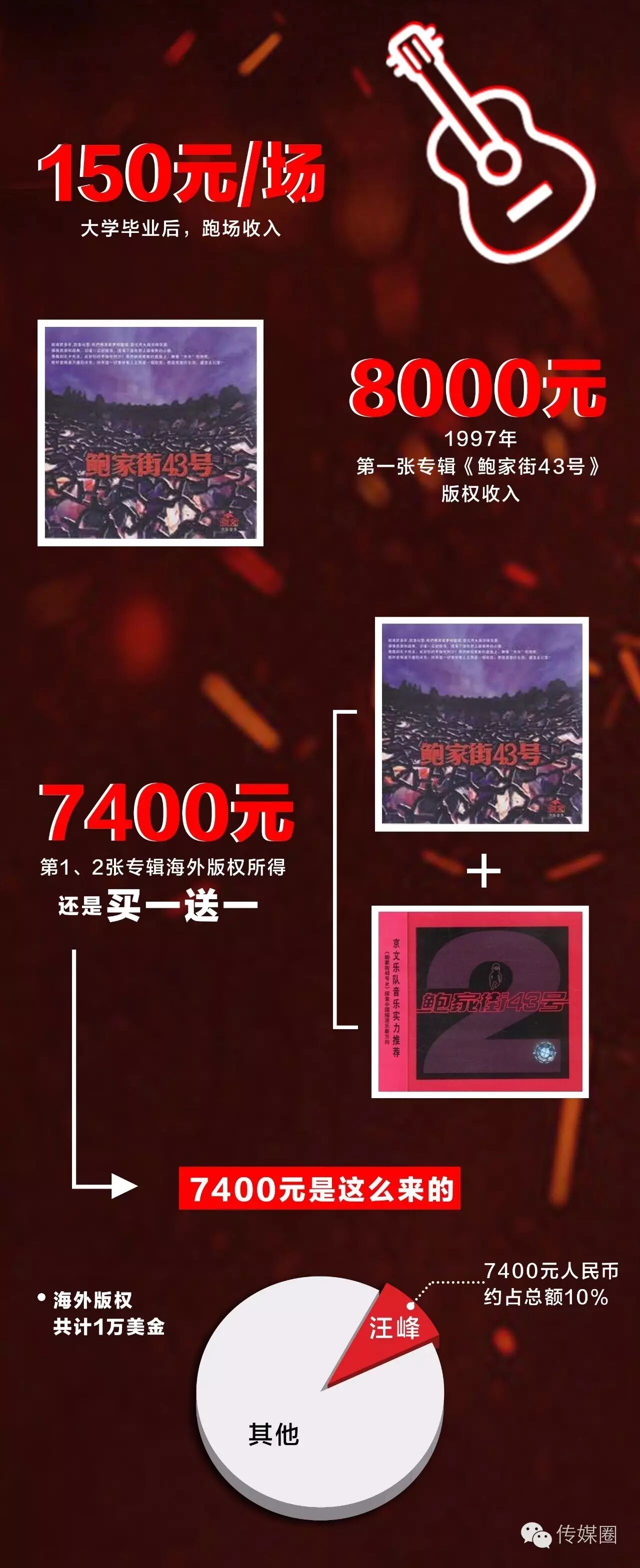 以扛起中国商业摇滚大旗的汪峰为例,在星空演讲中他坦言:“我的歌曲历年来的下载量达到了3亿次,但从写歌到现在的几十年里,我所有的音乐作品通过版权获得的收益只有60万。”