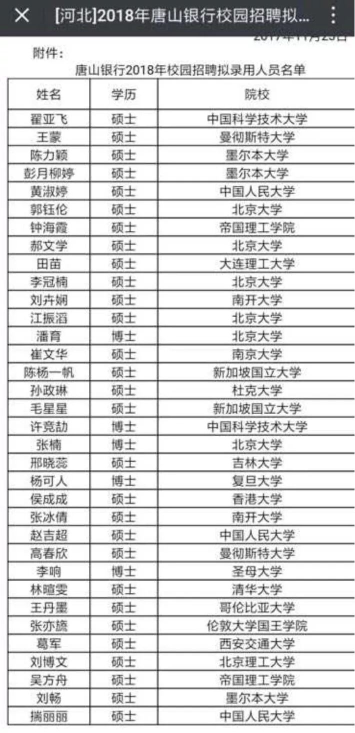 而在市场上并不出名的唐山银行,其流传出来2018年校招拟录取名单中,海外名校就占据半壁江山,而国内院校基本上也是211和985。