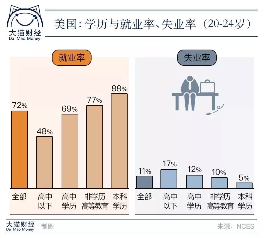 中国并没有教育与收入相关的调查或者统计数据,但是有国外的数据可以参考。也就是说,学历越高,就业率越高而对应的失业率也越低。