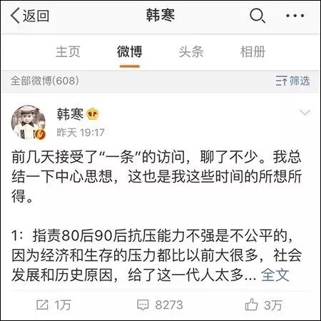 1月8日晚,韩寒在微博发表长文提起退学往事,他感慨:退学是一件很失败的事情,说明在一项挑战里不能胜任,只能退出,这不值得学习。