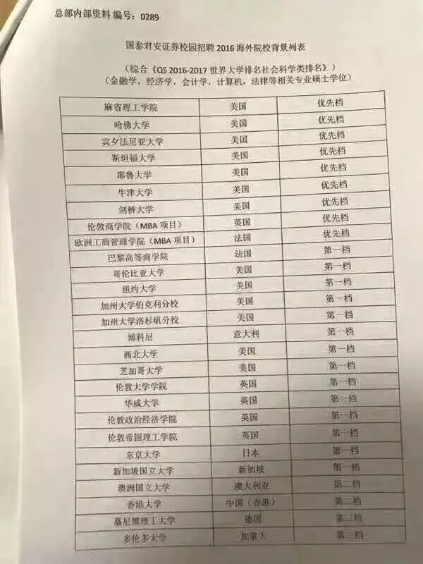 小编看到网上流传出来的国泰君安校招资料,其起点就是硕士学位,而优先档的教育背景基本是美国“藤校”和英国牛津、剑桥。即便如港大、港中文等香港名校,也是位列第二档。