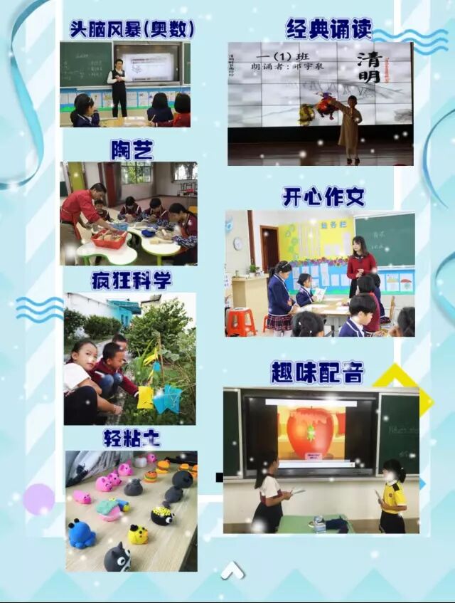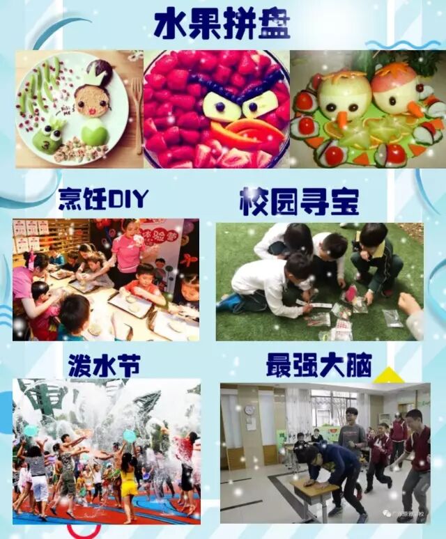 在夏令营中,每天都有一项主题活动哦。包括“1元生存体验”、“校园寻宝”、“最强大脑”、“烹饪DIY”、“泼水节”、“捉鱼活动”、“无敌风火轮”、“水果沙拉拼盘”……感觉很好玩的样子哟!