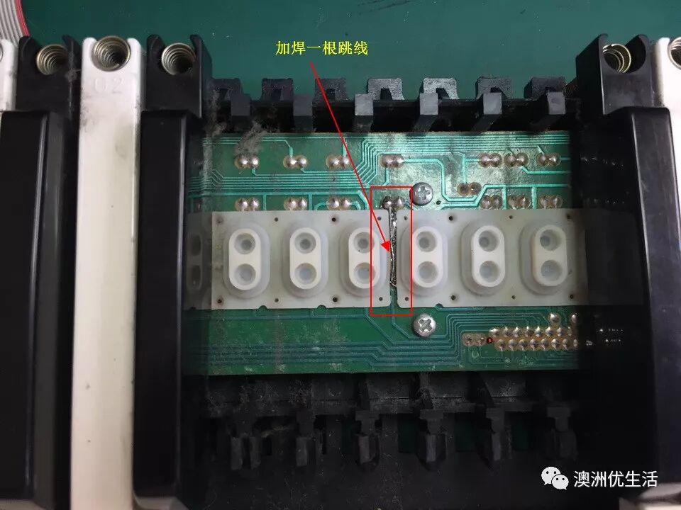 用三用表检测,发觉C=1健关联的印制线路铜箔霉断了,马上加焊一根跳线把断开的线路板铜箔接通,如图: