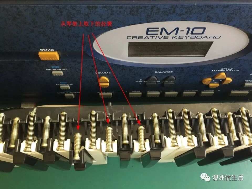 首先把C=1健及附近的几个琴健和琴键架之间的拉簧取下,再把这几个琴键卸下,如图