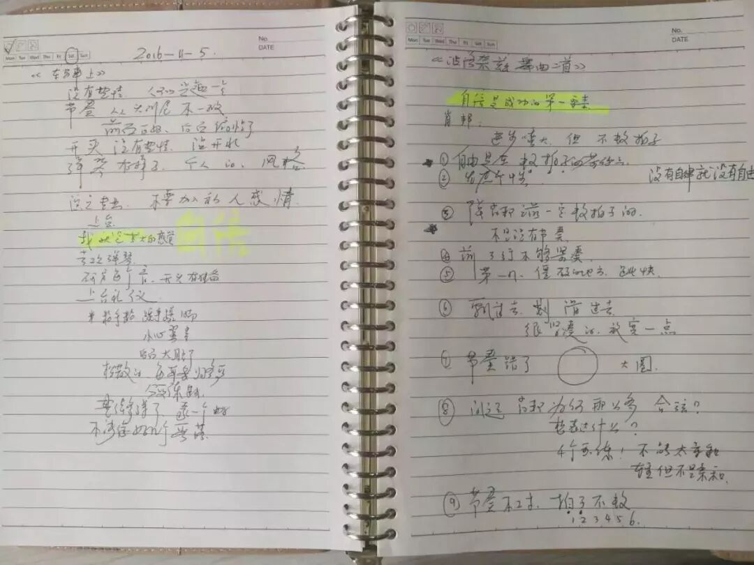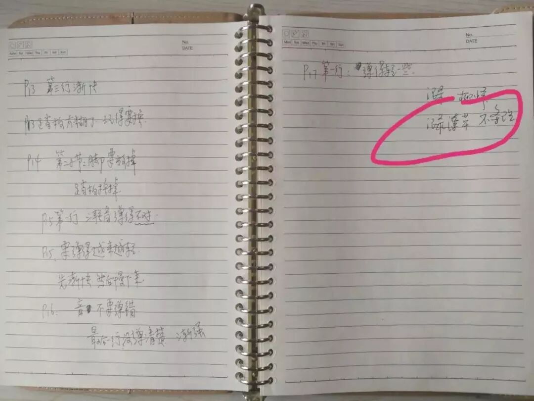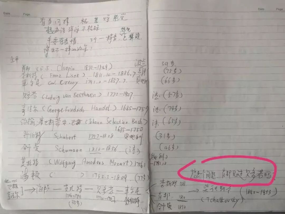 这是韩立诚的爸爸记录的钢琴课笔记——