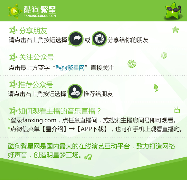 想随时欣赏到她的音乐直播,请下载“酷狗繁星APP”,搜索她的房间号即可观看!
