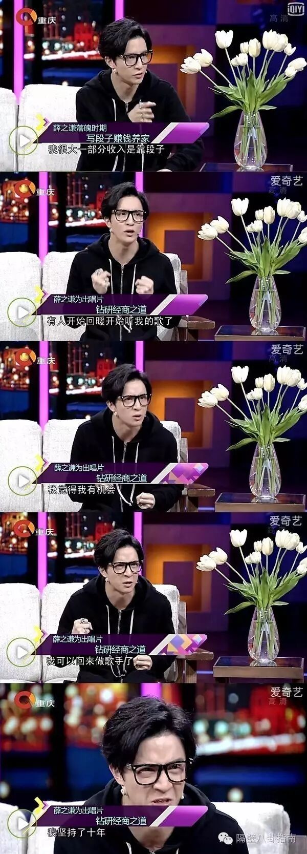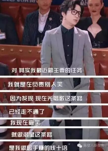 其实仔细看谦谦的搞笑能看得出他那细微的疲惫,为了营造自己的段子手形象,他为了搞笑而搞笑。看的久了会发现,薛之谦的幽默并不是像黄渤那样,从外在形象到骨子里的自然流露,夸张的动作和表情是硬让那个在音乐里无比认真,阳光帅气的面容挤出了段子手的形象,虽然他的笑点脑洞都是那么不一般但让我有时候也会尴尬。