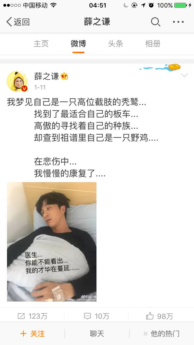 谦谦真正重新火起来是在去年,是在歌火人不火,直至段子手综艺小王子这些名号给火起来之后真正才火的,是在一年参加四十多档综艺节目、满负荷消耗下的火的。薛之谦毫不避讳地承认,他在“硬着头皮做综艺,再干一年一定会疯”;而为了他视之为生命的“音乐”,可以把所有饭碗都丢了,包括他当成事业来经营的微博。