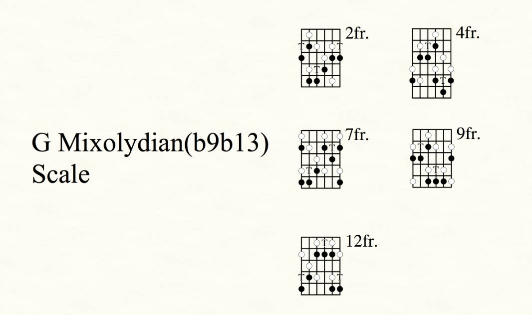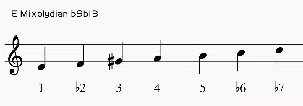 在Mixolydian的基础上把9(2)音和13(6)音降低半音就得到了Mixolydian b9b13这条音阶: