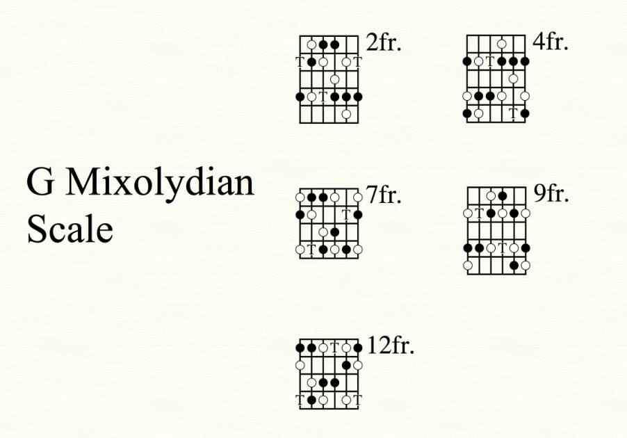 大家在练习的过程中,可以先练习一下Mixolydian各个把位的弹法: