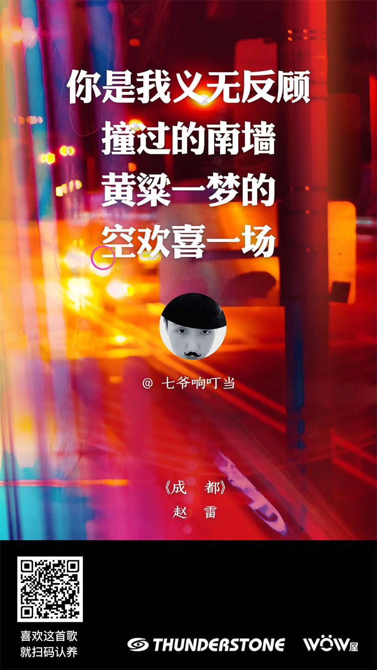 朦胧又美好的感情里,有男孩皱巴巴的衣袖,有路灯下一对璧人的挽手,也有女孩被亲吻的额头。当然除了爱情,还有赵雷对成都这座城市的记录和留恋,小城里的阴雨并没有冲淡赵雷的记忆,却激发了他的灵感,这是生活所能给予的最大馈赠。