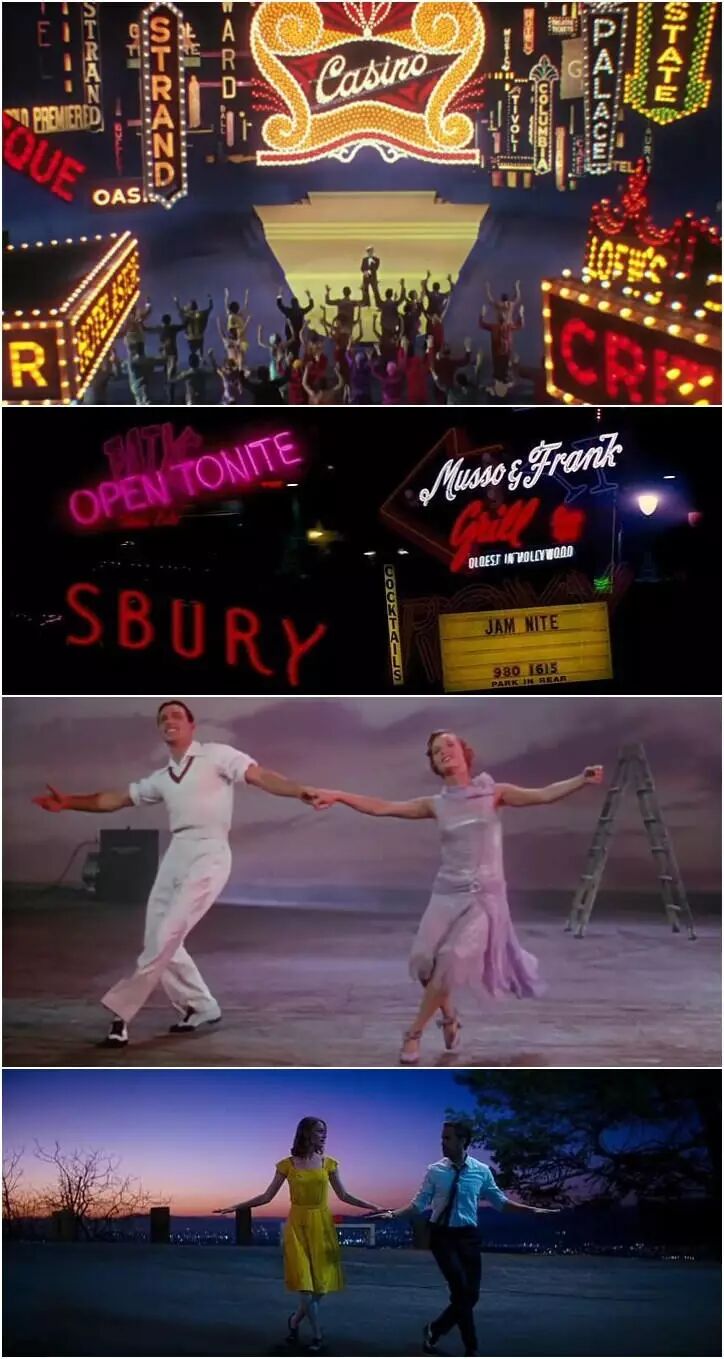 米娅在闺蜜的怂恿下流连于各种娱乐场所,同时画面出现了酒吧标牌名字的集合。《雨中曲》中,吉恩·凯利在“片中片”中作为领舞者走在百老汇街道上,周身同样挂着各种厂牌的名称。