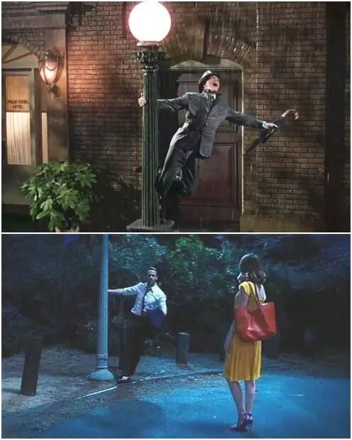 高司令饰演的塞巴斯蒂安和米娅在好莱坞山间散步,塞巴斯蒂安情不自禁地抓住路灯杆跳起舞来,这和吉恩·凯利在《雨中曲》中演唱“Singin’ in the Rain”时所做的动作一模一样。