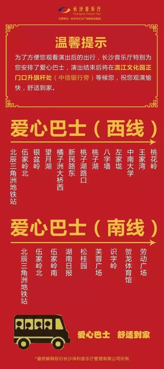 音乐会结束以后,音乐厅安排有免费的安心巴士(西线巴士将经过湖南大学南校区各个站点,财院校区师生可乘坐地铁原路返回)