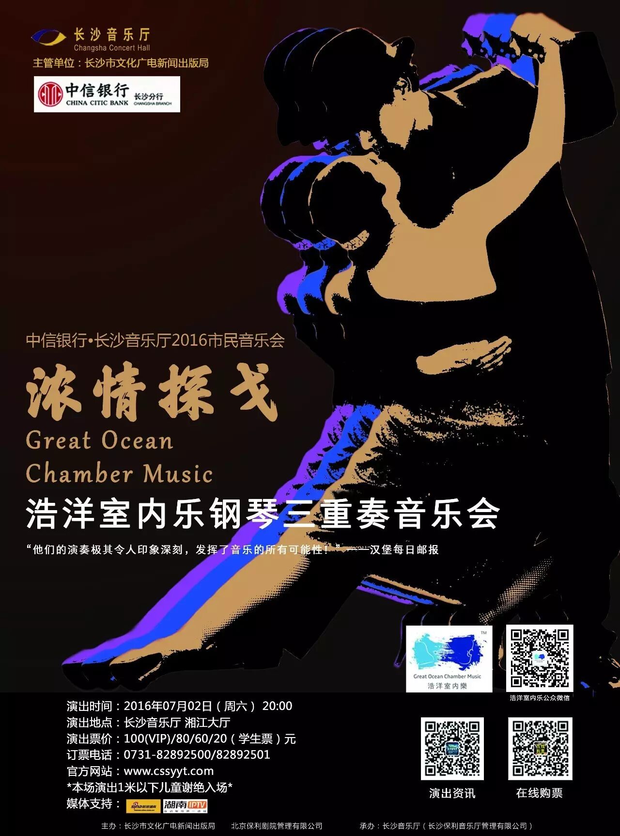 演出地点:长沙音乐厅 湘江大厅演出票价:100(VIP)/80/60/20(学生票)元