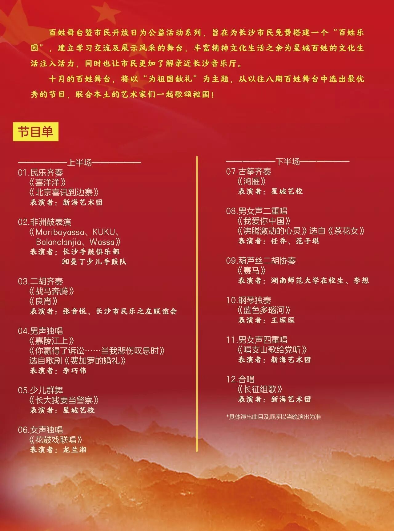 十月的百姓舞台,将以“为祖国献礼”为主题,从以往八期百姓舞台中选出最优秀的节目,联合本土的艺术家们一起歌颂祖国!