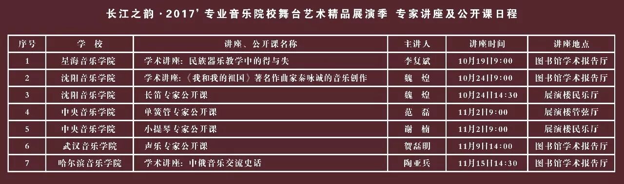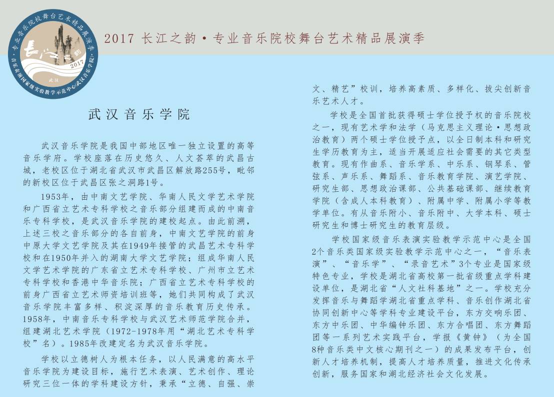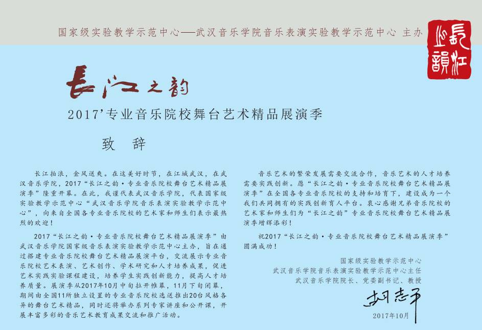 2017年10月至11月,由国家级实验教学示范中心——武汉音乐学院音乐表演实验教学示范中心主办的“长江之韵”2017专业音乐院校舞台艺术精品展演季将在武汉音乐学院隆重举行。