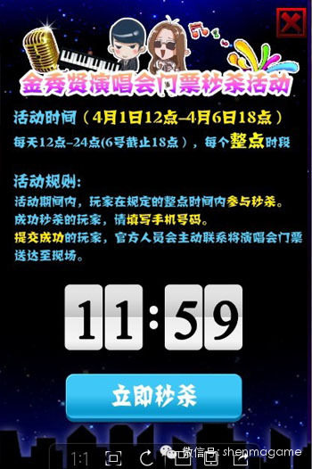 2、活动期间内每天12:00--24:00(6号截止为18:00)。每个整点时刻均可参与秒杀,成功秒杀的玩家可填写手机号并提交,提交成功后,官方人员会主动联系您,将演唱会门票送达至现场。