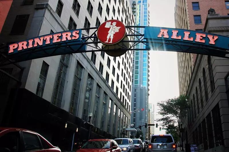 横跨街区上空的“Printers”招牌颇为引人注目。这条狭窄的巷子被命名“印刷胡同”,因这里曾经营2家报社、10家印刷厂与13家出版社。其间著名的“HATCH SHOW PRINT” 创立于1879年,它曾长期为《大奥普里》演出印刷海报, 如今这里是音乐海报迷的淘宝圣地。Jimmy Hyde's Carousel Club曾是许多纳什维尔音乐家经常光顾的爵士乐场所。