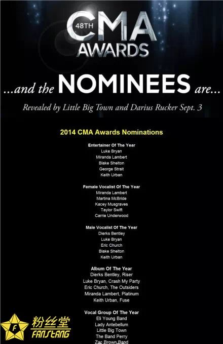 2014年第48届美国乡村音乐奖首批提名揭晓,出村天后Taylor Swift 再度提名年度最佳女歌手,Luke Bryan、Miranda Lambert、Blake Shelton、George Strait和Keith Urban等均获提名~ 主持人将继续由Carrie Underwood和 Brad Paisley担任~11月5日直播!小堂微信:FansTangOfficial