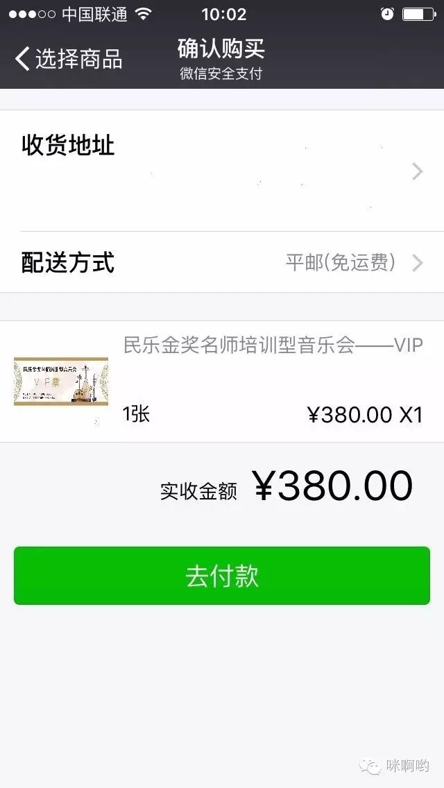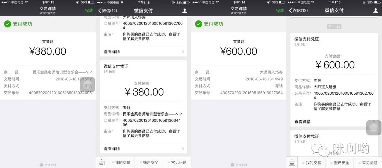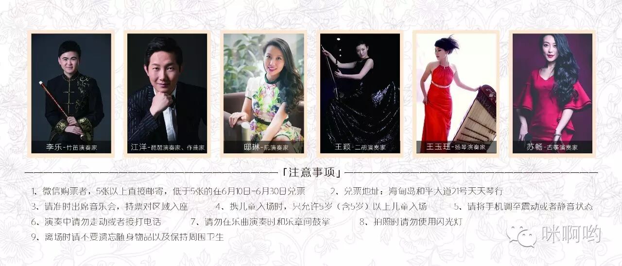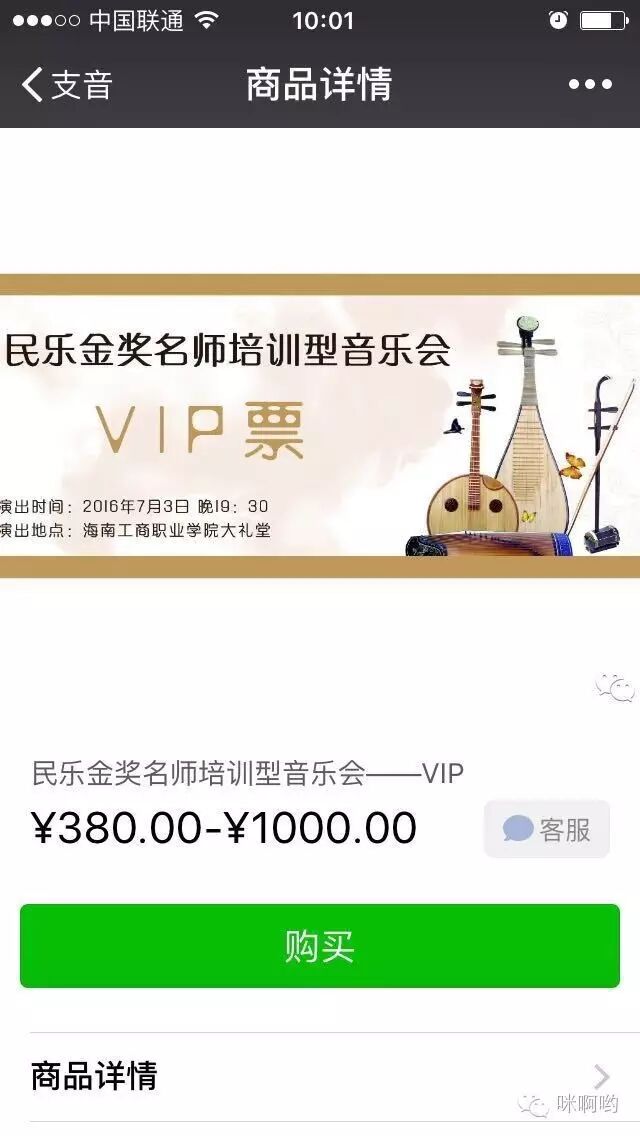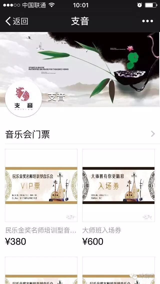 当您在网站(支音网)或者微信上看到关于“民乐金奖名师培训型音乐会”时,在文章下方会有“微信二维码”呈现,这时需您用微信扫一扫进行关注,或点击直接关注。当关注成功时页面下方会有“乐企宣传”一栏,点击后会出现“微信商店”等小栏目,这时再点击“微信商店”就会进入购买页面,选择您所需票种进行点击,出现票价区间,不要质疑,下方“商品详情”为您解答。当价格明确数量选定时,请准确填写个人信息,完成后保存,再点击购买,付款完成后请保存购票凭证,以方便现场凭图换票。完成以上步骤,您的音乐会门票就轻松到手啦!(注:如您在其他网站看到“民乐金奖名师培训型音乐会”时,购票需关注“支音”微信公众号进行购买,方法——搜索“支音”,找到“支音”微信公众号平台,微信扫一扫进行关注,关注之后步骤同上)