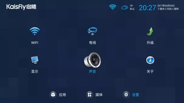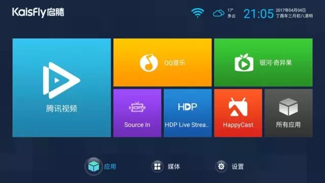 启腾kaisfly的UI界面是经过深度优化定制的安卓6.0系统,桌面设置共分三项导航栏目,为应用、媒体和设置。除了内置了多个实用APP外,启腾并没有特别限制第三方应用,因此我们可以通过当贝市场等应用市场下载自己需要的应用,可玩性还是比较强的。