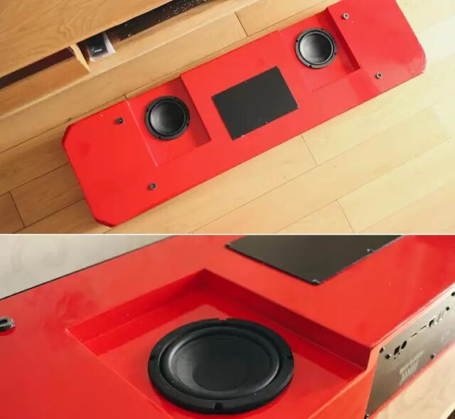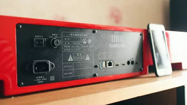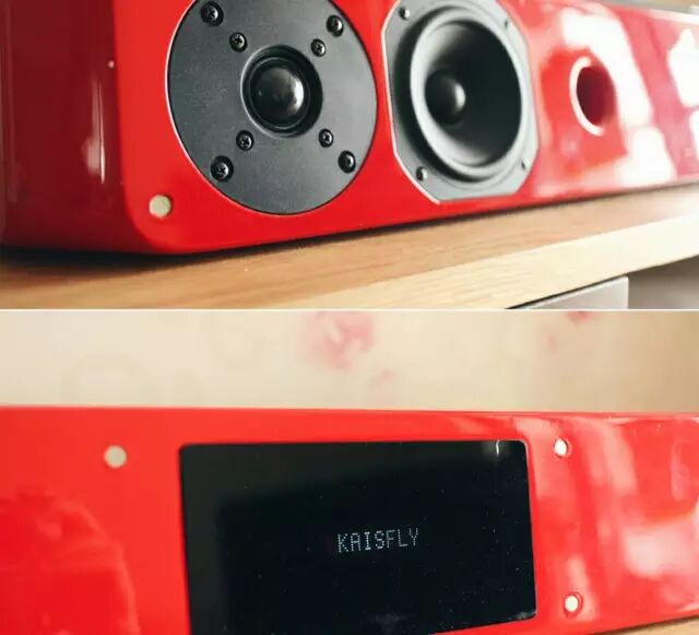 Kaisfly Q2约17kg,使用12mm HDF中密度板,整体机看起来庞大厚重。表面是钢琴烤漆处理,配色有黑、白、红、橙等多种配色,楼主这款是骚红色,出挑的色彩似乎对于客厅来说有点难以驾驭。