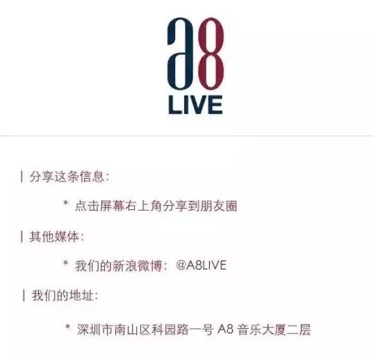 A8Live音乐现场,南中国最顶级的音乐现场,可容纳近千人(摆位450+人,站立1000+人)超近距离感受每一场演出。顶尖设备及技术管理团队,可承办接纳中型音乐会、演唱会、歌迷见面会、发布会等相关活动,是深圳最具有市场竞争力的专业展演场地哦!A8创客咖啡厅&剧场预定电话:华小姐 13502812815
