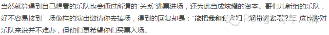 这点,编辑个人因为工作原因常在各地出差,感觉地区来说这种现象并不是太明显,北京应该是较多,这件事情上我个人认为是这样。钱也只是个常见交换物,你说票值50我就觉得不值,更别说拿“劳动力”“贡献”这些抽象的东西做“等价交换物”。市场不理想,很多时候是帮个忙,这种隐形的置换一方觉得不匹配后也许会撕逼,也许会变卦。但总之是个交换。主办的设计师,帮拍照的,哪怕是去印刷店取宣传品的,获取一次福利怎么了。音乐节还是各种志愿者呢,商演的时候去抓一条活动公司盯执行的兼职学生狗问问他们拿多少,为啥音乐节的志愿者兄弟们不说话,因为他们觉得这种交换非常值,一切这些声音不应该来源于“老炮蹭票”,我不带观众我还带俩果呢!我这次没带我演的时候还带票房呢,这和邀请VIP客户没什么本质上的区别。哪怕这单不成咱们细水长流,当然还不是客户的也可能将来得是客户,那将来再说呗。
